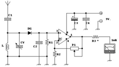 Индикатор, показанный на рис. 3, содержит перестраиваемый входной контур, связанный с электрической антенной через конденсатор С1. Напряжение принятого сигнала поступает на диодный детектор (выпрямительный диод DG и сглаживающий фильтр С2 R1). Выпрямленное напряжение подается на вход усилителя постоянного тока (микросхема IC), а с его выхода на стрелочный прибор. Вспомогательные элементы, и R3 предназначены для регулировки чувствительности - резистором R1 устанавливается глубина отрицательной обратной связи, а резистор R3 определяет предельный ток измерительного прибора [6].