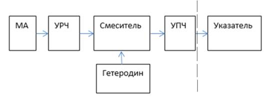 Гетеродин. Гетеродин создаёт колебания фиксированной вспомогательной частоты, которые в блоке смесителя смешиваются с поступающими извне колебаниями высокой частоты. В результате смешения двух частот, входной и гетеродина, образуются ещё две частоты (суммарная и разностная). Разностная частота в выбранной структуре индикатора используется как промежуточная частота, на которой происходит основное усиление сигнала. Далее сигнал из смесителя поступает в усилитель промежуточной частоты.