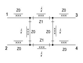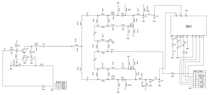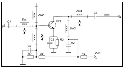 Zш4 - четвертьволновый трансформатор полного сопротивления. Имеет длину λ/4. Служит для согласования активной части выходного сопротивления усилительного каскада к значению 50 Ом.