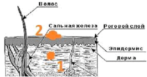 на верхнем слое эпидермиса, то есть между дермой и поверхностью кожи (точки 1 и