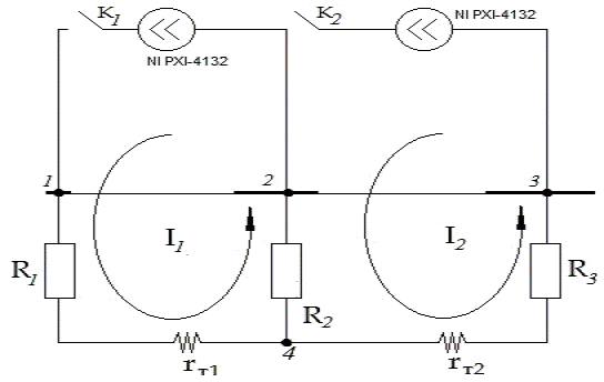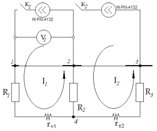 На схеме изображена эквивалентная схема прохождения тока через тело человека. Измеритель сопротивления работает от двух высокоточных источников тока NI PXI-4132 фирмы NationalInstruments. Ключи К1 и К2 замыкают ветви электрической цепи I1 и I2соответственно. Величина подаваемого тока I1=I2 = 100мкА. При прохождении тока через R2 токи I1 и I2 компенсируют друг друга, и, таким образом падение напряжения на R2 нулевое и электрод 2 как будто опускается в то чку цепи 4, то есть, в нашем случае, как будто оказывается под кожей. Это позволяет точно измерить сопротивление эпидермиса и дермы, исключая влияние на результат измерения сопротивление под пассивным электродом.