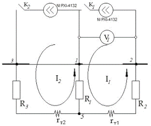 Для достижения высокой точности измерения напряжение снимается при двух вариантах включения источников тока (1 и 2 этапы измерения), после чего полученные значения заносятся в систему уравнений: