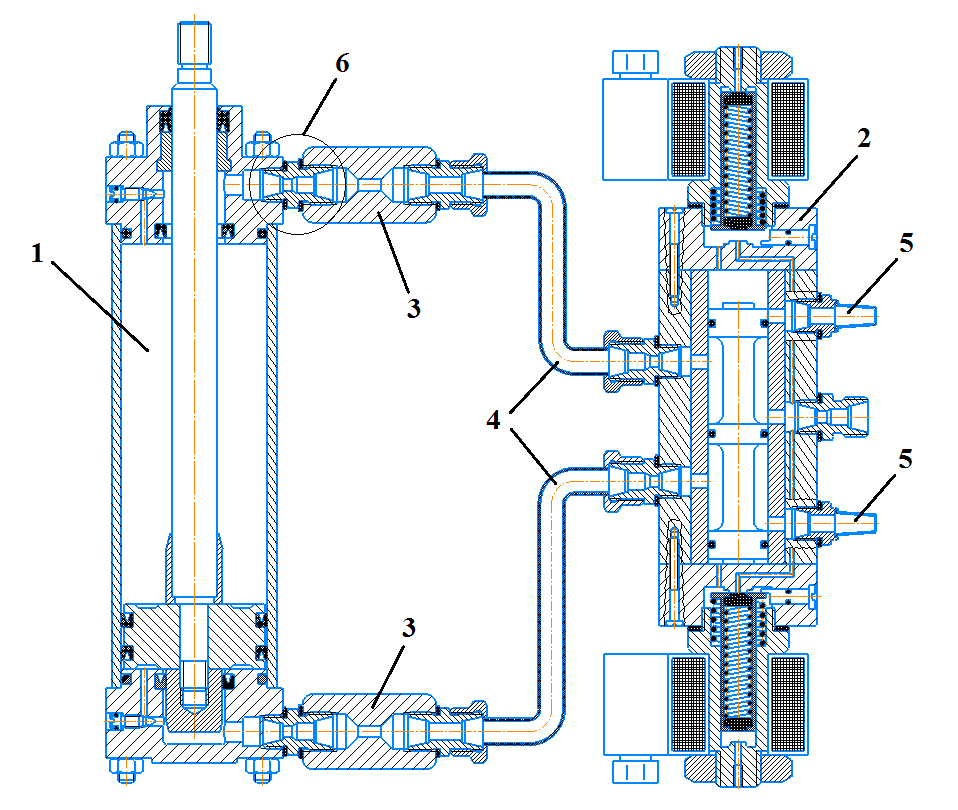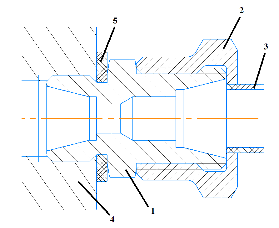 Сам штуцер 1 со стоит из двух присоединительных концов, выполненных по ГОСТ 22525-77 «Соединения трубопроводов резьбовые. Концы корпусных деталей под накидные гайки». С одной стороны, один конец ввинчивается в резьбовое отверстие корпуса 4, а с другой – крепится к трубопроводу 3 при помощи накидной гайки 2. Для герметичного соединения между штуцером 1 и корпусом 4 располагается уплотнительное кольцо 5.