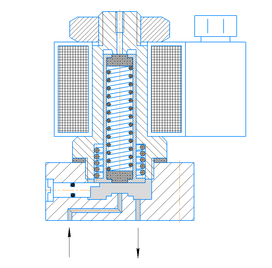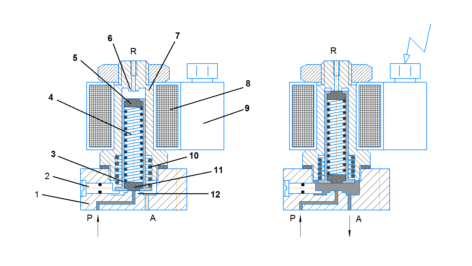 Снаружи гильза 7 охватывается приводной электромагнитной катушкой 8. Если электромагнитная катушка обесточена, якорь 3 прижат пружиной 10 к седлу клапана 12, перекрывая канал Р, по которому подводится сжатый воздух; выходной канал А соединен с атмосферой через пазы на наружной поверхности якоря. Напряжение на катушку 8 подается через присоединительный элемент — коннектор 9, при этом якорь 3, преодолевая усилие пружины 10, поднимается до седла клапана 6, закрывая канал R выхода воздуха в атмосферу и открывая канал, соединенный с отверстием для подведения сжатого воздуха. Сжатый воздух подается в линию потребителя (канал А).