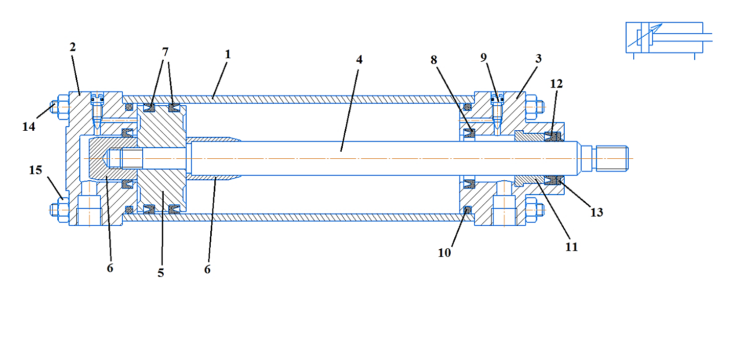 демпфирующими втулками 6 на штоке 4; на поршне 5 установлены поршневые манжеты 7 для герметичного разделения поршневой штоковой полости; в крышках цилиндра 3 и 2 установлены уплотнительные кольца 8 и дроссельный винт 9; для герметичного уплотнения между крышками 3 и 2 и гильзой 1 устанавливается резиновое кольцо 10; в передней крышке 3 устанавливается направляющая втулка 11, которая служит опорой для штока пневмоцилиндра; также в передней крышке 3: установлены штоковая манжета 12 для герметичности штоковой полости и грязесъёмное кольцо 13 для предотвращения попадания загрязняющих частиц в штоковую полость. Гильза 1, крышки 3 и 2 скреплены шпильками 14 и гайками 15.