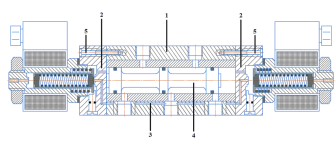 Распределитель на рис. 7 представляет собой базовый распределитель с двусторонним пневматическим управлением 1 и комбинацию двух пилотных электромагнитных 3/2 пневмораспределителей 2 расположенных на концах базового распределителя. Сжатый воздух подводится к пилотным распределителям, располагающимся, как правило, на торцах базового распределителя, по специальным каналам 3, выполненным в корпусе последнего и соединенным с входным отверстием. Запорно-регулирующим элементом (ЗРЭ) в данном распределителе является золотник 4, который движется в базовом распределителе. Пилотные электромагнитные 3/2 пневмораспределители 2 скреплены с базовым распределителем 1 винтами 5.