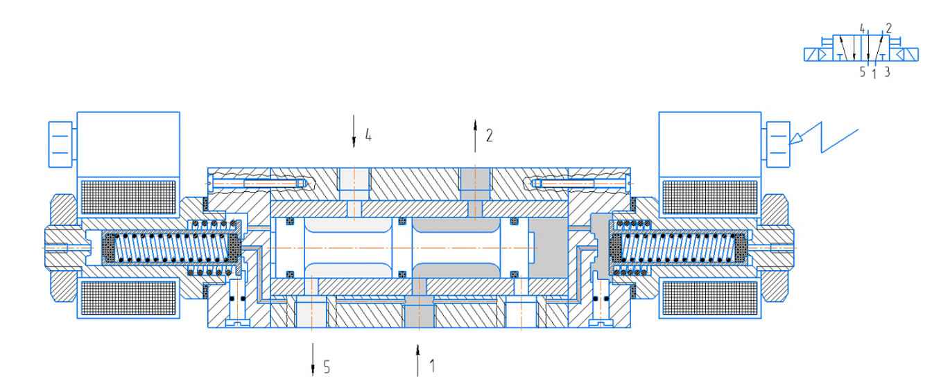 Аналогичным образом, при подаче напряжения на левую катушку, золотник движется вправо; напорная магистраль через отверстия 1 и 4 соединена с поршневой полостью пневмоцилиндра, а штоковая полость через отверстия 2 и 3 соединена с атмосферой (рис. 9).