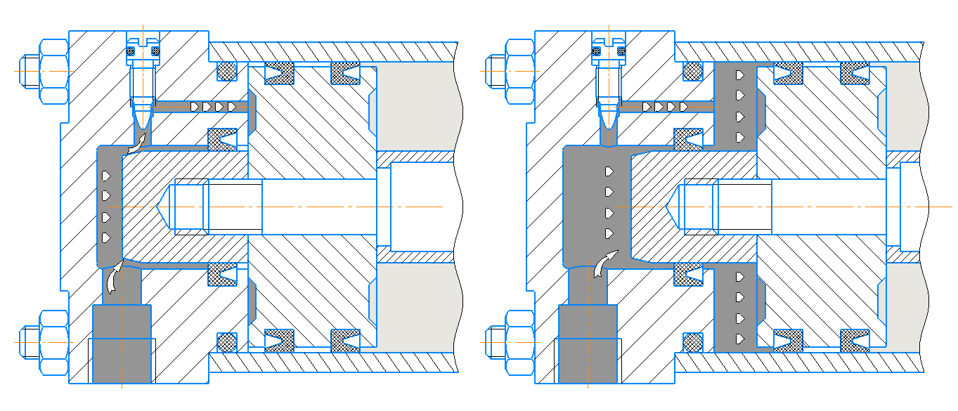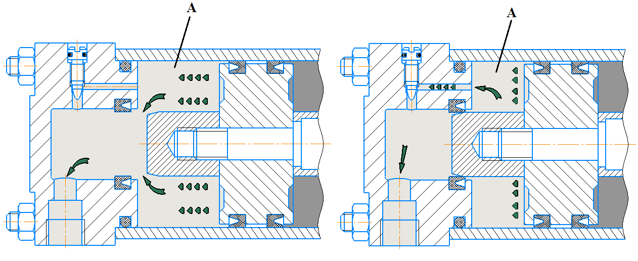Между крышкой и поршнем образуется «воздушная подушка». При дальнейшем движении поршня воздух в запертом объеме начинает сжиматься, давление возрастает, что приводит к торможению поршня. Регулированием дросселя подбирается его постоянное сечение таким образом, чтобы торможение происходило без ударов о крышку и без резкой остановки поршня при входе манжеты в полость крышки.