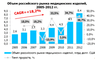 Объем российского рынка медицинского оборудования и изделий в 2012 году достиг 8,4 млрд долл. США, долгосрочный темп прироста рынка составляет 18,2% в год.