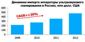 В 2012 году объем импорта оборудования для ультразвукового исследования составил 477 млн долл. США. Среднегодовой темп роста импорта оборудования для УЗИ в Россию в 2009 - 2012 гг. составил +30%.