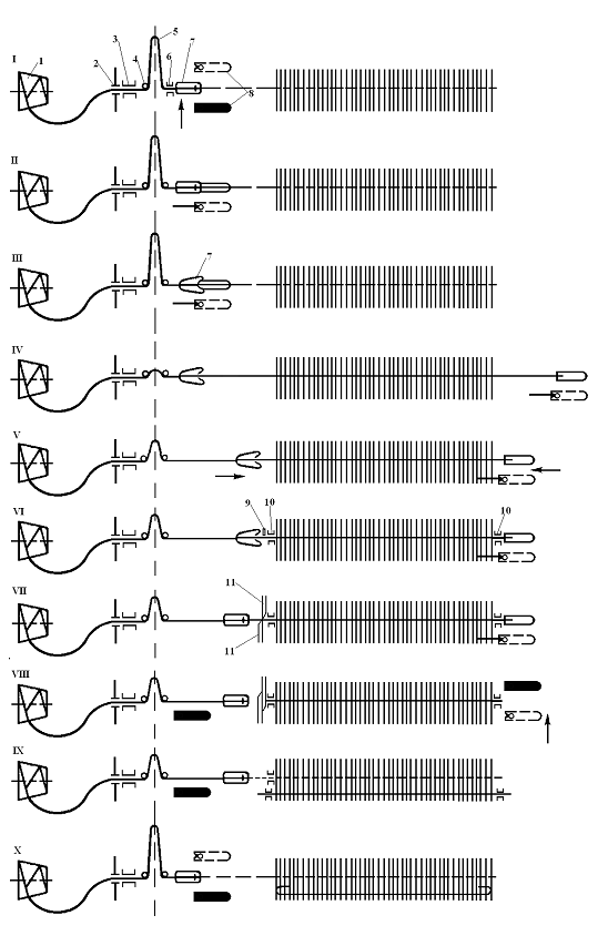 Положение VII - раскрытые ножницы 11 подошли к уточной нити. Прокладчик, находящийся в приемной коробке, раскрывает зажимы и освобождает уточную нить.
