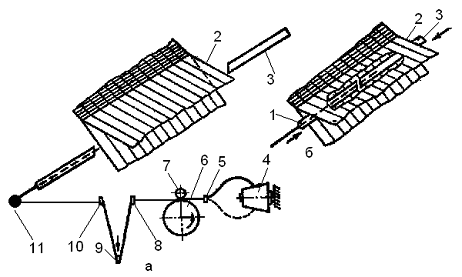 В момент прокидки нити с двух сторон в открытый зев 2 (рис. 2б) вводятся рапиры 1 и 3. Примерно в середине зева рапиры сходятся и образуют воздушный канал. Уточная нить из рапиры 1 под воздействием потока воздуха, нагнетаемого в правую рапиру и эжектируемого левой рапирой 3, переходит в нее. Затем рапиры выходят из зева, а свободный конец тягой воздуха удерживается в левой рапире. После выхода рапир из зева проложенная нить прибивается бердом к опушке ткани. Кромкообразующее устройство формирует закладные или брошюровочные кромки.