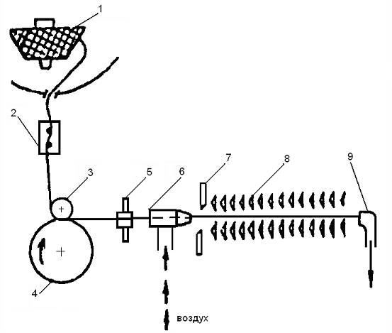 При образовании зева струя воздуха из форсунки 6 переносит уток отмеренной длины через канал конфузора 8, вошедшего в зев, с одного края основы на другой. Для повышения эффективности прокладывания конец утка подсасывается соплом 9. После прокидки уточная нить отрезается ножницами 7 и ее конец фиксируется от обратного вытягивания из сопла и зажимается тормозом 5.