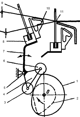 1 (рис. 5), установленный на кулачковом валу. Кулачок поднимает ремизку, а