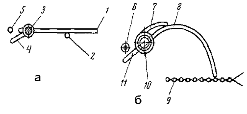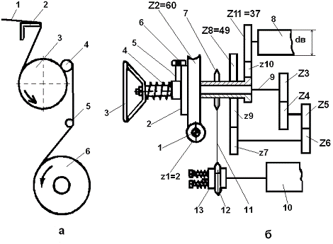 Рисунок 9 - Схема уточной вилочки (а) и контролера опушки ткани (б) станка АТПР