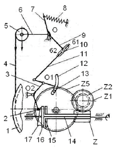 Ведомый диск 15 через втулку соединяется с червяком Z, который входит в зацепление с червячной шестерней Z1. На одной оси с шестерней Z1 находится поднавойная шестерня Z2, соединенная с навойной шестерней Z3.