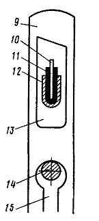 Ламельная рейка (рис. 10) представляет собой два электрических проводника - стальную обойму 12 и латунную шину 10, изолированных друг от друга диэлектриком 11. К проводникам подведено напряжение 12 В. На рейке прорезями 13 набраны ламели 9 в количестве, равном числу нитей основы.