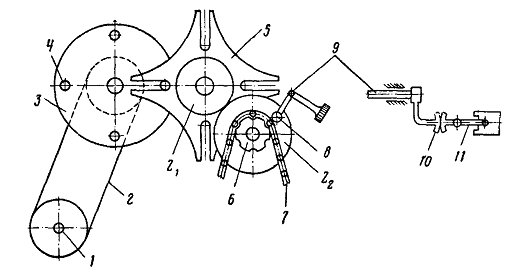 Вальяном ткань непрерывно отводится из рабочей зоны станка. Навивание ткани на товарный валик 10 осуществляется через звездочку 7, цепь 11, звездочку 12 и фрикционную муфту 13. В начале наматывания ткани на товарный валик окружная скорость его немного превышает окружную скорость вальяна, что компенсируется скольжением во фрикционной муфте, которая может регулироваться изменением силы сжатия пружин фрикционных колец муфты.