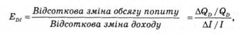 де Ем/В- перехресна еластичність попиту; Д<?ол- зміна обсягу попиту на товар А; Двш /ЯОА o 100 % - відсоткова зміна обсягу попиту на товар А; ДЯП-зміна ціни на товар В; АРВ/РВ* 100% - відсоткова зміна ціни на товар В. Для товарів-субститутів обсяг попиту на товар А змінюється прямо пропорційно зміні ціни на товар В: Ем в > 0. Для товарів-комплементів обсяг попиту на товар А знаходиться в оберненій залежності від зміни ціни на товар В: Для незалежних товарів (які не є спорідненими) коефіцієнт перехресної еластичності має нульове значення, тобто ЕОА/в = 0. Це означає, що, наприклад, зміна ціни на пральний порошок не впливає на обсяг попиту на взуття. Еластичність попиту за доходом Дослідження еластичності попиту за доходом вимагає аналізу структури товарів з позиції поділу їх на нормальнітв нижчі. Нормальні товари - це товари, попит на які зростає в міру зростання доходів споживачів. Нижчі товари - це товари, попит на які в міру зростання доходів споживачів зменшується (неякісні товари; послуги щодо ремонту одягу та взуття тощо). Еластичність попиту за доходом показує ступінь зміни попиту на товар, зумовлений зміною доходу споживача. Коефіцієнт еластичності попиту за доходом визначається як відношення відсоткової зміни обсягу попиту на товар до відсоткової зміни обсягу доходу споживача.