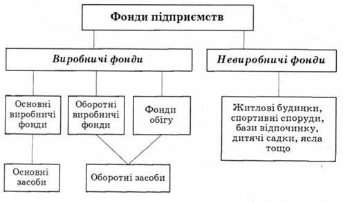 Виробниче підприємство повинне мати засоби виробництва, які є основою продуктивної діяльності підприємства. Вони становлять основний капітал підприємства. У сучасній економічній літературі вживають поняття "капітал" і "фонди". Деякі економісти ототожнюють їх, тобто вважають, що це є ресурси, необхідні для організації виробництва. На нашу думку ці поняття не можна вважати тотожними, бо фонди включають не тільки засоби виробництва, а й грошові ресурси, необхідні для відновлення засобів виробництва і виплати заробітної плати. Отже, всі матеріально-речові і грошові ресурси, якими володіє підприємство, становлять фонди підприємства. Фонди підприємства поділяють на виробничі і невиробничі. Виробничі фонди — це ті матеріально-речові засоби, які беруть участь у виробництві. Вони поділяються на основні та оборотні. За допомогою виробничих фондів виробляється продукція, яка становить фонди обігу. Фонди обігу — це готова продукція, що перебуває на складі підприємства, а також відвантажена, але ще не оплачена покупцями, і кошти на рахунку підприємства, необхідні для придбання предметів праці та виплати заробітної плати. Невиробничі фонди — це житлові будинки, спортивні споруди, будинки культури, бази відпочинку, дитячі садки, ясла тощо. Фонди обігу мають виробниче призначення, бо грошові кошти, виручені від реалізації продукції, використовуються на виробничі цілі.
