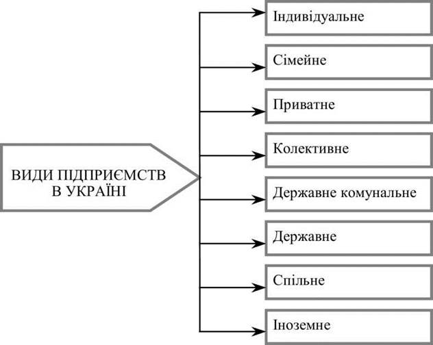Значна різноманітність підприємств вимагає їхньої класифікації за відповідними ознаками, які дають змогу підкреслити особливості того чи іншого підприємства, врахувати їх при організації виробництва та управління. Основні ознаки класифікації підприємств за їх видами:1) за глобальною метою функціонування (комерційні; некомерційні);2) за видом попиту, який задовольняється (підприємство для задоволення зовнішніх потреб; домогосподарства для задоволення внутрішніх потреб);3) за сутністю кінцевої продукції (підприємства, що виробляють матеріальні блага; підприємства, що виробляють послуги);4) за галузевою та предметною спеціалізацією (підприємства гірничорудні, нафтодобувні, металургійні; підприємства легкої, харчової промисловості; підприємства торгівлі);5) за формою власності ( державні; приватні; комунальні);6) за розміром (великі; малі; середні);7) за агрегацією майна (автономні підприємства; об’єднання). Важливою ознакою класифікації підприємств є їхня правова форма, тобто комплекс правових і господарських норм, які визначають характер, умови й способи формування економічних відносин між працівниками і власниками підприємства, між підприємством та іншими суб’єктами господарювання, підприємствами та органами державної влади. Організаційно-правові форми господарювання підприємств, передбачені законами та іншими нормами господарського права і залежить від: форми власності; обсягу і асортименту продукції, що випускається; формування капіталу; характеру і змісту діяльності; способів входження у об’єднання; методів ведення конкурентної боротьби. Суб’єкти господарювання-підприємства-юридичні особи. Комерційна діяльність: господарче товариство; повне товариство; командитне товариство; товариство з обмеженою відповідальністю; товариство з додатковою солідарною відповідальністю; акціонерні товариства; особисте підприємство; виробничі кооперативи; державні унітарні підприємства; комунальні підприємства. Некомерційні підприємства: споживчий кооператив; суспільні і релігійні об’єднання; фонди; спілки. Правові норми регулюють як порядок організації (створення) підприємства. внутрішні і зовнішні відносини, так і його діяльність.
