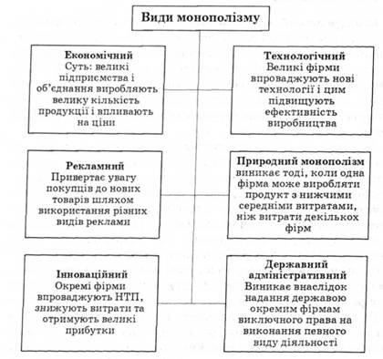 1. Економічний монополізм. Він виростає з конкуренції. Суть його в утворенні великих підприємств, об'єднань, які концентрують у своїх руках виробництво і збут основної частини продукції однієї або кількох галузей. Це дає їм можливість впливати на рівень цін з метою забезпечення собі високих прибутків. Такий тип монополізму є найбільшою загрозою ринковій економіці і тому повинен постійно контролюватися державою. 2. Технологічний монополізм. Проявляється в тому, що окремі фірми захоплюють і монополізують певні технології. Це має місце в першу чергу в таких галузях, як металургійна, електротехнічна, хімічна промисловість, транспорт. У таких галузях сама технологія робить ефективним лише велике виробництво. 3. Рекламний монополізм. Полягає в заманюванні покупців різними видами реклами: торговою маркою, незвичним упакуванням, зниженням цін для постійних клієнтів, використанням популярних каналів телебачення тощо. 4. Інноваційний монополізм. Характеризується тим, що окремі фірми, використовуючи передові технології, нові форми організації праці та виробництва, виявляються в кращих умовах, бо виробляють нову продукцію, яка має кращі якості і користується широким попитом. Особливістю цього типу монополізму є те, що він має тимчасовий характер. Він зникає в міру розповсюдження і впровадження в практику нових наукових досліджень. 5. Природний монополізм. До цього монополізму відносяться природні державні монополії, зокрема, монополія на організацію і регулювання грошового обігу, на добування стратегічної сировини і виробництво стратегічних товарів, на виробництво окремих товарів, на надання водо -, газо -, тепло - та енергопослуг. Природна монополія виникає й існує тоді, коли одна фірма може постачати продукцію для всього ринку і має нижчі витрати виробництва на одиницю продукції, ніж мали б конкурентні фірми. Існування її з точки зору суспільства є доцільним, бо усунення її і створення декількох підприємств може привести до збільшення витрат на надання послуг і зростання цін. 6. Державний адміністративний монополізм. Був характерний для командно-адміністративної системи. Суть його в тому, що держава монополізує всі сфери життєдіяльності суспільства, максимально обмежуючи конкуренцію. Монополізм цього типу є найбільш негативним і не повинен допускатися. Розрізняють два види ринкових монополій: монополію продавця і монополію-покупця. Монополія-продавець — це фірма, яка є єдиним виробником товару, що надходить на ринок. Ціна на такий товар установлюється фірмою і не залежить від кон'юнктури ринку. В ролі монополії-покупця може виступати держава, великі фірми, державні організації. Наприклад, організації для закупівлі сільськогосподарської продукції, газу, нафти та іншої продукції добувної промисловості. Основними організаційними формами монополій є картелі, синдикати, трести, концерни та інші об'єднання. Монополії, процес монополізації економіки мають істотні негативні наслідки: - по-перше, монополії придушують конкуренцію - важливу рушійну силу економічного прогресу; - по-друге, вони здатні збільшувати прибутки, зменшуючи обсяг випуску продукції і підвищуючи її ціну; - по-третє, схильні до уповільнення науково-технічного прогресу; - по-четверте, схильні до хижацького використання природних ресурсів та забруднення довкі