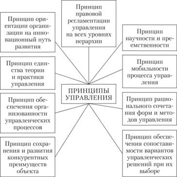 Принципи управління полягають у наступному: • принцип правової регламентації управління на всіх рівнях ієрархії - організація повинна функціонувати і розвиватися відповідно до вимог її статуту, зміст якого має відповідати законодавству країни; • принцип єдності теорії і практики управління - будь-яке управлінське рішення має відповідати логіці, принципам і методам системи управління; • принцип забезпечення порівнянності варіантів управлінських рішень при їх виборі - ефективність управлінського рішення можна забезпечити тільки при дотриманні наукових підходів і принципів менеджменту, вибору із застосуванням методів оптимізації одного раціонального рішення з безлічі альтернативних рішень щодо виконання даної мети; • принцип єдності теорії і практики управління - будь-яке управлінське рішення має відповідати логіці, принципам і методам системи менеджменту і вирішувати одну з її практичних завдань; • принцип орієнтації організації на інноваційний шлях розвитку - при проектуванні структури системи управління, визначення методів повинні встановлюватися перспективи розвитку організації, становлення на інноваційний шлях розвитку;