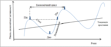 Найвідчутніше впливають на процес відтворення середні цикли. В економічній теорії їх вважають базовими. За змістом середньострокові цикли є економічними циклами всього відтворювального процесу, оскільки відображають циклічність розвитку не лише виробництва, а й розподілу, обміну та споживання. Матеріальною основою середніх циклів є фізичне оновлення основних засобів виробництва, насамперед їх найактивнішої частини — знарядь праці. Економічні цикли середньої тривалості мають чотири послідовні фази: кризу, депресію, пожвавлення, піднесення. Основними фазами є криза та піднесення. Циклам притаманні певні загальні риси, передусім однакова послідовність фаз. Але на різних етапах економічного розвитку суспільства і за різних умов відтворення циклу його фази виявляються по-різному. Криза (рецесія, падіння). Вона є основною фазою, що формує і визначає особливості й тривалість економічного циклу. Передусім охоплює найчутливіші сфери грошово-кредитних зв'язків, оптової, а відтак і роздрібної торгівлі.