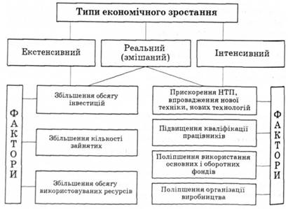Причини поступального розвитку економіки кожного окремо взятого підприємства, як і країни загалом, полягають у складних і суперечливих зв'язках між суспільним виробництвом і кінцевим його призначенням - задовольняти потреби людей, служити споживанню. З одного боку, потреби людей спонукаються виробництвом. Новостворений продукт спричинить потребу в ньому, а виробництво сформує умови задоволення. З іншого боку, задоволена потреба і поява нової диктує необхідність повторення і нарощування виробництва з обов'язковим удосконаленням якості для задоволення нових потреб. Саме зростаючі потреби людей спонукають до діяльності продуктивні сили, що й спроможні задовольнити ці потреби. Потреби суспільства зростають як у кількісному, так і в якісному виразі. Збільшення обсягів виробництва вимагає насамперед збільшення чисельності населення. Однак зростають не лише потреби в їжі, одязі та ін. Важливим є якісне задоволення споживача, тобто поліпшення якісних характеристик. І цей процес безперервний. Життєздатність кожної системи визначається саме тим, як вона може задовольнити потреби. Економічне зростання в масштабах усього суспільного виробництва - це збільшення річного обсягу продукції й наданих послуг унаслідок діяльності різних суб'єктів господарювання країни. Показником, за допомогою якого характеризують економічне зростання, є валовий національний продукт. Економічне зростання можна обчислювати в абсолютних і відносних величинах. Наприклад, якщо валовий національний продукт у звітному році становить 50 млрд грн, а у базовому - 48, то він зріс на 2 млрд грн, або на 4 %. У реальному житті допускається зменшення обсягу валового продукту, або стагнація, коли цей показник залишається без змін. Тоді це засвідчує відсутність економічного зростання. На практиці розрізняють два типи економічного зростання - екстенсивний та інтенсивний. Екстенсивний ріст передбачає можливість збільшення обсягів виробництва продукції аграрними підприємствами через залучення додаткових чинників виробництва - посівних площ, поголів'я тварин, засобів виробництва. При цьому їх якісний і технічний рівень, технологія виробництва залишаються незмінними. Незмінною є продуктивність землі й тварин. Приріст продукції досягається внаслідок кількісного збільшення участі засобів праці у виробництві. Екстенсивний ріст був актуальним за недостатнього рівня науково-технічного прогресу і коли виникала необхідність в освоєнні нових територій. Нові території інколи освоюються і тепер. Екстенсивний тип зростання забезпечує нарощування економічного потенціалу через розширення трудової діяльності. З цим пов'язано виробництво абсолютного додаткового продукту. Найважливіші чинники екстенсивного типу зростання: