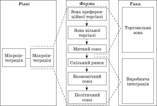 Міжнародна економічна інтеграція - процес зближення та об'єднання економік різних країн в єдиний господарський комплекс на основі поглиблення стійких взаємозв'язків у виробництві і розподілі праці, взаємодії відтворювальних структур на різних рівнях національних господарств, що зумовлює зближення згідно з міждержавними угодами господарських механізмів і узгоджене регулювання міждержавними органами . Міжнародна економічна інтеграція - процес зближення та взаємопроникнення національних господарств групи країн, спрямованих на створення єдиного господарського механізму Інтеграція має наступні рівні: 1) взаємодія на рівні підприємств та організацій (створення транснаціональних корпорацій); 2) взаємодія на рівні держав, партій та організацій, соціальних груп, окремих громадян різних країн; 3) інтеграційне угруповання як результат міжнародного об'єднання. Еволюція міжнародної економічної інтеграції відбувалася у кілька етапів. Кожен етап інтеграції має свої особливості Загальна особливість цих етапів полягає в тому, що між країнами, які вступили у той чи інший етап інтеграції, ліквідуються певні (залежно від рівня їх розвитку) економічні бар'єри. Внаслідок цього у межах інтеграційного об'єднання формується відносно замкнутий ринковий простір. Під дією ринкових регуляторів (цін, відсотків тощо) у ньому виникає ефективніша територіальна і галузева структура виробництва. Це забезпечує країнам-учасницям суттєву перевагу, оскільки зростає продуктивність праці, зникає необхідність у витратах на митний контроль за зовнішньоекономічними операціями . Сьогодні у світі нараховується близько 20 економічних угруповань.