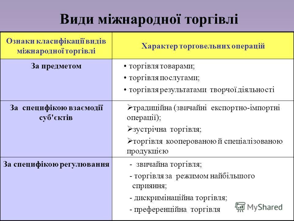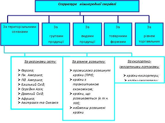 Міжнародні економічні відносини - це система економічних зв'язків між країнами з приводу виробництва, розподілу, обміну та споживання товарів (послуг), що вийшли за межі відповідних національних господарств ; це економічні відносини в системі світового господарства До основних форм МЕВ відносять: міжнародну торгівлю товарами і послугами; міжнародний рух капіталів і закордонних інвестицій; міжнародну міграцію робочої сили; науково-технічне співробітництво; валютно-кредитні відносини. Міжнародна (світова) торгівля - форма МЕВ, що основується на глибокому міжнародному поділі праці, спеціалізації окремих країн на виробництві окремих товарів та послуг згідно з їхнім техніко-економічним рівнем, географічними та іншими умовами. На частку торгівлі припадає нині приблизно 80% всього обсягу міжнародних економічних відносин Світовий ринок - це розвинена сфера товарного обміну, що ґрунтується на міжнародному поділі праці. Характерною ознакою світового ринку є існування особливої системи - світових цін. Для зовнішньої торгівлі важливе значення має конкурентоспроможність товарів, які продаються на світовому ринку. Зовнішня торгівля відбувається за світовими цінами, хоча на однаковий товар у межах світового ринку вони можуть бути різними. Головними елементами зовнішньої торгівлі є експорт та імпорт. Експорт - продаж товарів та послуг зарубіжному контрагенту. Імпорт - придбання (купівля) в іноземного контрагента товарів та послуг. Сума експорту та імпорту становить зовнішньоторговельний оборот. Різниця між вартісними обсягами експорту та імпорту складає торговельне сальдо, яке буває позитивним або активним (коли вартість вивезених товарів і послуг перевищує вартість ввезених) і від'ємним (за зворотного співвідношення). Основними формами міжнародної торгівлі є: біржова, аукціонна, міжнародні торги. Реальну результативність зовнішньої торгівлі відображає платіжний баланс, який складається з двох колонок - надходжень і платежів, тобто включає дві групи показників: надходження від суб'єктів зовнішньоекономічної діяльності з інших країн (нерезидентів) і зовнішні видатки (платежі) суб'єктів зовнішньоекономічної діяльності даної країни (резидентів). Якщо надходження платежів перевищує видатки, то платіжний баланс вважається активним (має позитивне сальдо); у протилежному випадку - пасивним (має від'ємне сальдо). Фундаментом платіжного балансу є зовнішньоторговельний баланс, який розраховується на основі даних статистики митних служб (враховуючи обсяги товарів, які реально перетинають кордони), тоді як платіжний баланс - за результатами експортних та імпортних надходжень. Часто виникають складнощі при розрахунку платіжного балансу, оскільки платежі та надходження до нього можуть у часі не збігатися з рухом товарів (послуг), а також у зв'язку зі здійсненням розрахунків у різних валютах за різними курсовими співвідношеннями Внутрішня структура як торговельного, так особливо платіжного балансу, динамічна і мінлива. На їх стан впливає багато зовнішніх і внутрішніх факторів: циклічність економічного розвитку, динаміка світових цін (особливо на сировину), зміна курсів валют, зростання або зниження внутрішнього попиту на споживчі та інвестиційні товари, зовнішньоекономічна політика держави, що спрямована на зростання чи стри