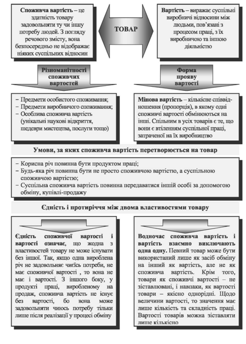 Товар - це продукт праці, виготовлений з метою обміну або продажу, а не для особистого споживання. Товаром може бути як речовий продукт, так і послуга або інформація, а також робоча сила (праця), земля, капітал тощо, які, хоч і не є продуктами праці, в умовах розширеного товарного виробництва, коли воно стає загальним, перетворюються в товари. Властивості товару 1)Здатність задовольняти певну потребу людини; 2)Придатність для обміну на інші товари. Будь-який товар має дві властивості: задовольняти якусь людську потребу і властивість обмінюватися на інші товари. Перша з них називається корисністю або споживчою вартістю товару, друга - міновою вартістю, яка є формою більш глибокої суті - цінності або вартості товару.