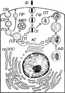 -поздняя эндосома, Л - лизосома, ГФ - гетерофагосома, АФ - аутофагосома, ОТ