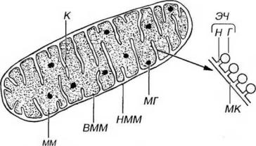 Рис. 3-12. Митохондрия. НММ - наружная митохондриальная мембрана, ВММ - внутренняя митохондриальная мембрана, К - кристы, ММ - митохондриальный матрикс, МГ - митохондриальные гранулы, МК - мембрана кристы, ЭЧ - элементарные частицы, Г - головка, Н - ножка.