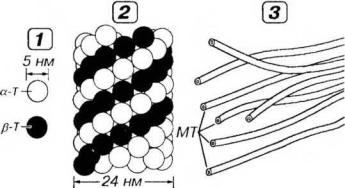 Рис. 3-14. Строение микротрубочки. 1 - мономеры тубулина, образующие протофиламенты, 2 - микротрубочка, 3 - пучок микротрубочек (МТ).