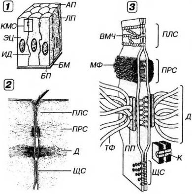 Рис. 5-2. Межклеточные соединения эпителиоцитов в области их латеральной поверхности. 1 - область расположения комплекса межклеточных соединений (выделена рамкой), 2 - вид межклеточных соединений на ультратонких срезах, 3 - трехмерная схема строения межклеточных соединений (по К.Де Дюву, 1987, с изменениями). БМ - базальная мембрана, БП - базальная поверхность, АП - апикальная поверхность, ЛП - латеральная поверхность эпителиоцитов, КМС - комплекс межклеточных соединений, ПЛС - плотное соединение, ПРС - промежуточное соединение, Д - десмосома, ИД - интердигитации, ВМЧ - внутримембранные частицы, ПП - пластинка прикрепления, МФ - микрофиламенты. ТФ - тонофиламенты, ЩС - щелевое соединение, К - коннексоны.