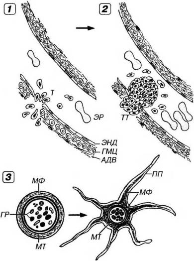 Рис. 7-6. Изменения тромбоцитов при повреждении стенки сосуда. 1 - адгезия тромбоцитов (Т) в области поврежденной стенки сосуда, 2 - агрегация Т с формированием тромбоцитарного тромба (ТТ), 3 - изменения формы Т и распределения в них элементов цитоскелета при активации. АДВ - адаентиция сосуда, ГМЦ - гладкие миоциты (стенки сосуда), ЭНД - эндотелий. При стимуляции Т образуют длинные псевдоподии (ПП), кольцо микротрубочек (МТ) сжимается, смещая гранулы (ГР) к центру; микрофиламенты (МФ) формируют кольцо по периферии от кольца МТ, а также располагаются пучками в ПП.