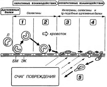вом адгезивных белков селектинов, экспрессируемых на лейкоцитах и эндотелии). Оно отражает неустойчивое равновесие локальных сил прикрепления (адгезии) лейкоцита к эндотелию и гемодинамических сил, отрывающих его от стенки сосуда. При качении скорость перемещения лейкоцита уменьшается примерно в 100 раз по сравнению с таковой в кровотоке. Начальная активация эндотелия сосуда (расположенного вблизи очага повреждения) цитокинами и медиаторами воспалительных реакций вызывает повышение экспрессии на его поверхности адгезивных молекул и вовлечение в процесс качения все большего числа лейкоцитов. Этот этап является обратимым (быстро блокируется при инактивации селектинов);