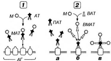 Рис. 2-2. Иммуноцитохимическое выявление веществ в клетках и тканях. 1 - прямой метод: специфические антитела (АТ) к исследуемому веществу - антигену (АГ) - конъюгируют с маркером (М), получая маркированные АТ (МАТ), которые специфически связываются с искомым АГ. 2 - непрямой метод: (а) клетки (ткань) обрабатывают первичными (немечеными) АТ (ПАТ), ПАТ специфически связываются с АГ, после чего клетки обрабатывают вторичными мечеными АТ (ВМАТ), полученными путем конъюгации вторичных (немеченых) АТ (ВАТ) с М (б). Поскольку для ВАТ роль АГ играют ПАТ, они специфически связываются с ними (в), тем самым косвенно выявляя и искомый АГ. Чувствительность непрямого метода выше, чем прямого, так как он обеспечивает связывание большего количества маркера с выявляемым веществом.