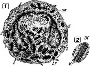 Рис 7-11. Эозинофильный гранулоцит. 1 - ультраструктурная организация, 2 - эозинофильная гранула (ЭГ). АГ - азурофильная гранула, К - кристаллоид.