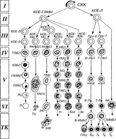 Рис 9-2. Схема кроветворения. I-VI - классы кроветворных клеток, СКК - стволовая клетка крови, КОЕ - колониеобразующая единица (родоначальная клетка): КОЕ-ГЭММ - КОЕ гранулоцитов, эритроцитов, моноцитов и мегакариоцитов, КОЕ-Э - КОЕ эритроцитов, КОЕ-Мег - КОЕ мегакариоцитов, КОЕ-ГМ - КОЕ гранулоцитов (нейтрофильных) и моноцитов, КОЕ-Г(Н) - КОЕ гранулоцитов (нейтрофильных), КОЕ-Мо - КОЕ моноцитов, КОЕ-Баз - КОЕ базофилов, КОЕ-Эо - КОЕ эозинофилов, КОЕ-Л - КОЕ лимфоцитопоэза, БОЕ-Э - бурст-образующая единица, про-В - про-В- лимфоцит, про-Т - про-Т- лимфоцит (протимоцит), ПЭБЛ - проэритробласт, БЭБЛ - базофильный эритробласт, ПХЭБЛ - полихроматофильный эритробласт, ОЭБЛ - оксифильный (ортохроматофильный) эритробласт, РЦ - ретикулоцит, Э - эритроцит. МегБЛ - мегакариобласт, МегЦ - мегакариоцит, ТЦ - тромбоциты, МоБЛ - моноцитобласт, ПМо - промоноцит, Мо - моноцит, МФ - макрофаг, МБЛ - миелобласты, ГШЦ - промиелоциты, МЦ - миелоциты, ММЦ - метамиелоциты, ПЯГЦ – палочкоядерные