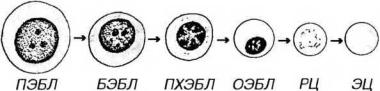 Рис. 9-3. Эритропоэз. ПЭБЛ - проэритробласт, БЭБЛ - базофильный эритробласт, ПХЭБЛ - полихроматофильный эритробласт, ОЭБЛ - оксифильный (ортохроматофильный) эритробласт, РЦ - ретикулоцит, ЭЦ - эритроцит.
