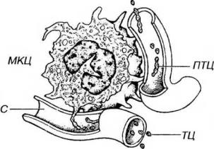 Рис. 9-4. Выделение тромбоцитов мегакариоцитом в кровоток. Мегакариоцит (МКЦ) образует узкие лентовидные отростки - филоподии, или протромбоциты (ПТЦ). которые через поры эндотелия синусов (С) красного костного мозга проникают в их просвет, где распадаются на отдельные тромбоциты (ТЦ).