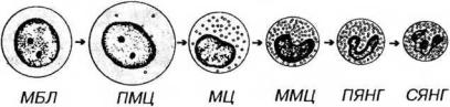 Рис. 9-5. Гранулоцитопоэз (на примере развития нейтрофильных гранулоцитов). МБЛ - миелобласт, ПМЦ - промиелоцит, МЦ - миелоцит, ММЦ - метамиелоцит, ПЯНГ - палочкоядерный нейтрофильный гранулоцит, СЯНГ - сегментоядерный нейтрофильный гранулоцит.