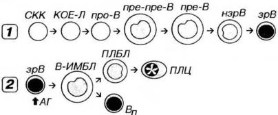 лимфоцитов представлена на рис. 9-6 (1). В ходе развития отмечается реаранжировка генома этих клеток, их выраженные функциональные и иммунофенотипические изменения, а также их некоторые морфологические преобразования.
