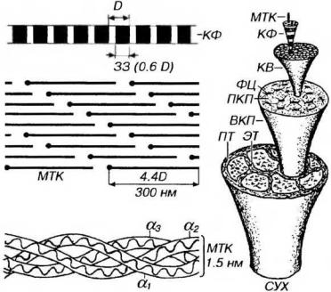 Рис. 10-6. Образование коллагеновой фибриллы и сборка фибрилл а коллагеновые структуры более высокого порядка. Молекула тропоколлагена (МТК) толщиной 1.5 нм и длиной около 280-300 нм образована тремя спирально скрученными полипептидными а-цепями. При упорядоченной внеклеточной агрегации, приводящей к образованию коллагеновых фибрилл (КФ) толщиной 20-120 нм, МТК связываются в продольные цепочки, которые располагаются параллельно друг другу. Внутри каждой цепочки МТК разделены промежутками - зонами зазора (33); в соседних цепочках МТК сдвинуты друг относительно друга на четверть своей длины. При негативном окрашивании наблюдается поперечная исчерченность КФ с периодичностью 6468 нм (D) вследствие отложения красителя в 33 (шириной 0.6 D). Пучки МТК формируют КФ, которые, в свою очередь, образуют коллагеновые волокна (КВ) диаметром 1-20 мкм. КВ образуют первичные коллагеновые пучки (ПКП), которые располагаются между рядами фиброцитов (ФЦ); группа ПКП, окруженная эндотендинием (ЭТ), формирует вторичный коллагеновый пучок (ВКП). Несколько ВКП, окруженных перитендинием (ПТ), составляют третичный коллагеновый пучок - сухожилие (СУХ).