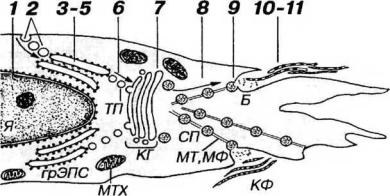 Рис. 10-7. Последовательные этапы синтеза коллагена и образования коллагеновых волокон фибробластом. Внутриклеточный этап: в ядре (Я) происходит образование иРНК, кодирующих синтез а-цепей коллагена (1); аминокислоты, необходимые для синтеза коллагена, поглощаются механизмом эндоцитоза и транспортируются к грЭПС (2); в грЭПС осуществляются процессы синтеза полипептидных а-цепей из аминокислот и их накопление в просвете цистерн (3), пострансляционные изменения а-цепей (4), образование молекулы проколлагена в результате сборки трех а-цепей (5). Молекулы проколлагена переносятся из грЭПС в комплекс Гольджи (КГ) посредством транспортных пузырьков (ТП) - (6); внутри КГ (7) происходит терминальное гликозилирование и упаковка молекул проколлагена в секреторные пузырьки (СП); молекулы проколлагена транспортируются в СП из КГ к плазмолемме (с помощью микротрубочек и микрофиламентов (МТ и МФ) - (8) и выделяются экзоцитозом в области ’’бухточки” (Б) - (9). Внеклеточный этап (фибриллогенез): отщепление регистрационных пептидов проколлагена с образованием нерастворимого тропоколлагена (10); полимеризация тропоколлагена с образованием коллагеновых фибрилл (КФ) и волокон (11). Процессы синтеза и секреции коллагена требуют большого количества энергии, продуцируемой митохондриями (МТХ).