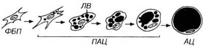 Рис. 11-1. Образование клеток белой жировой ткани из фибробластоподобного предшественника (ФБП) путем постепенного накопления липидных включений (ЛВ). При липогенезе формируются отдельные жировые капли, которые сливаются в единую, оттесняющую ядро и большую часть органелл к одному из полюсов. Клетка приобретает перстневидное строение. Предполагается, что при голодании, вызывающем усиление процессов липолиза, возможны обратные морфологические преобразования с формированием множественных жировых капель из одной и последующим их уменьшением и исчезновением. ПАЦ - преадипоциты, АЦ - адипоцит.