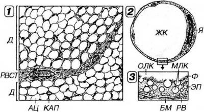 Рис. 11-2. Строение белой жировой ткани. 1 - дольки (Д) жировой ткани, разделенные прослойками рыхлой волокнистой соединительной ткани (РВСТ) с кровеносными сосудами и нервами. Внутри Д между адипоцитам (АЦ) располагаются малодифференцированные клетки, макрофаги, кровеносные капилляры (КАП) и нервные волокна. 2 - зрелый адипоцит, содержащий одну крупную жировую каплю (ЖК), которая занимает большую часть объема цитоплазмы. Уплощенное ядро (Я) смещено к краю клетки вместе с тонким ободком окружающей его цитоплазмы. 3 - участок цитоплазмы адипоцита с многочисленными эндоцитозными пузырьками (ЭП) и мелкими липидными каплями (МЯК), сливающимися с основной (ОЛК), которая, окружена тонкими филаментами (Ф). Снаружи адипоцит покрыт базальной мембраной (БМ), в которую вплетаются ретикулярные волокна (РВ).