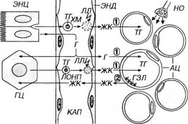 Рис. 11-3. Процессы отложения (1) и мобилизации (2) жиров в жировой ткани. Энтероциты (ЭНЦ) всасывают продукты расщепления жиров из просвета кишки и ресинтезируют их с образованием триглицеридов (ТГ), которые транспортируются в лимфу, а в дальнейшем в кровь в виде хиломикронов (ХМ). ХМ расщепляются в эндотелии (ЭНД) кровеносных капилляров (КАП) ферментом липопротеиновой липазой (ЛЛ) с выделением жирных кислот (ЖК), которые переносятся в цитоплазму адипоцитов (АЦ) и после реэстерификации образуют ТГ, транспортирующиеся в жировую каплю. ТГ в АЦ могут синтезироваться из глюкозы (Г). Гепатоциты (ГЦ) захватывают ЖК из крови или синтезируют их из Г, образуя ТГ, которые транспортируются в виде липопротеинов очень низкой плотности (ЛОНП). Гидролиз ЛОНП посредством ЛЛ приводит к образованию ЖК, которые переносятся в цитоплазму АЦ, образуя ТГ. При липолизе ТГ расщепляются ферментом гормональнозависимой липазой (ГЗЛ) и в виде ЖК транспортируются в кровь. Липолиз стимулируется норадреналином, который выделяется из нервных окончаний (НО), диффундирует в пространства между АЦ и связывается с рецепторами на их плазмолемме.